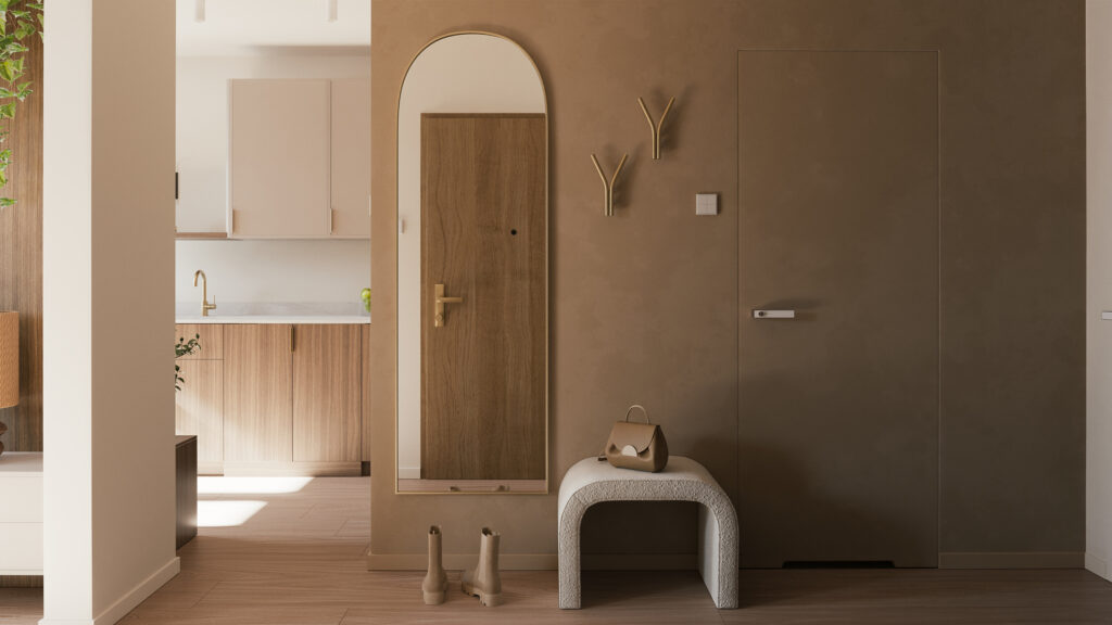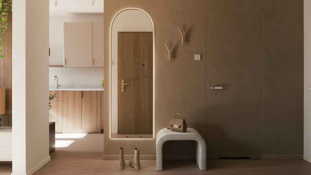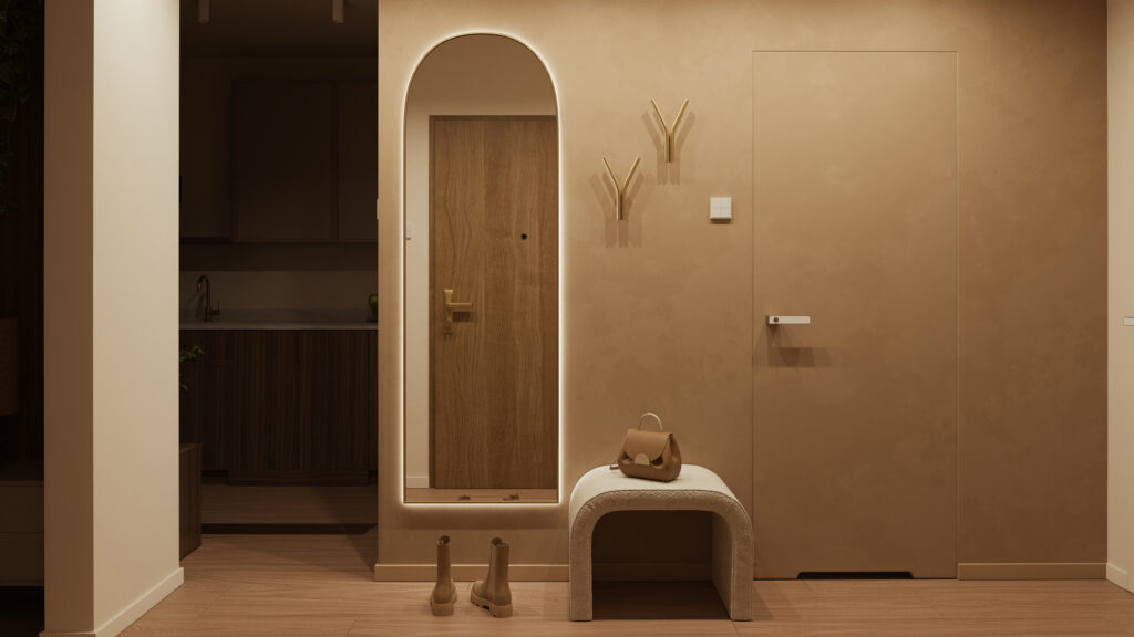 In this hallway visualization, we focused on light and subtle details – from the soft reflection in the mirror to delicate tonal shifts on the wall. It’s a small space, yet full of nuances that can take the lead in a render. We aimed for a calm, natural look – almost like a frame from real life.