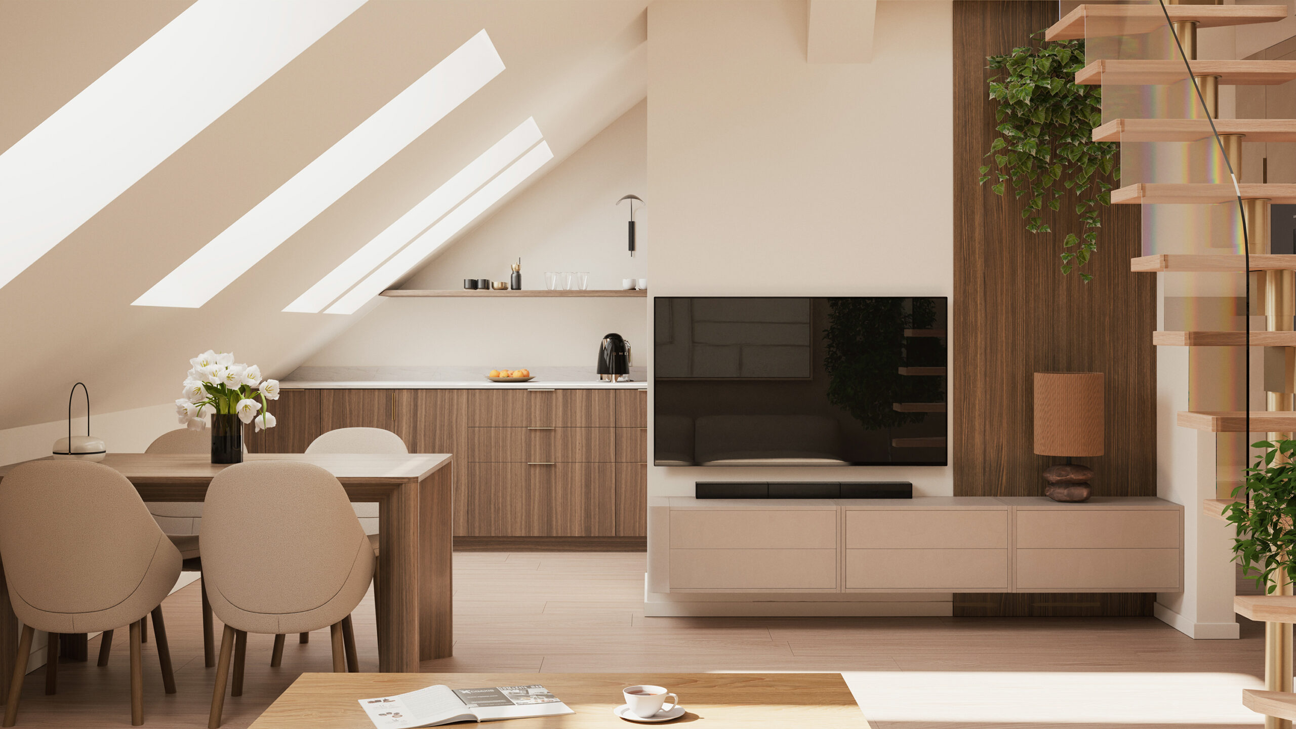 The image depicts a modern, stylish living space with a view of the Parisian cityscape. This is a 3D rendering of an apartment interior that showcases contemporary design elements such as sleek lines and minimalist furnishings. The room features an open floor plan with a combined kitchen and dining area. A variety of seating options, including chairs and sofas, are arranged around the center island to encourage conversation and interaction. This visualization contains the followinf 3D models: